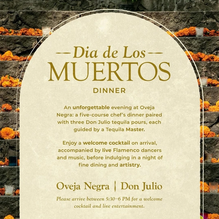 Savor an exclusive five-course dinner at Oveja Negra, beginning with an arrival cocktail and a captivating flamenco welcome accompanied by live music. The evening continues with a Don Julio tequila tasting, guided by a Tequila Master, and concludes with each guest departing with a bottle of Don Julio 70 Cristalino.